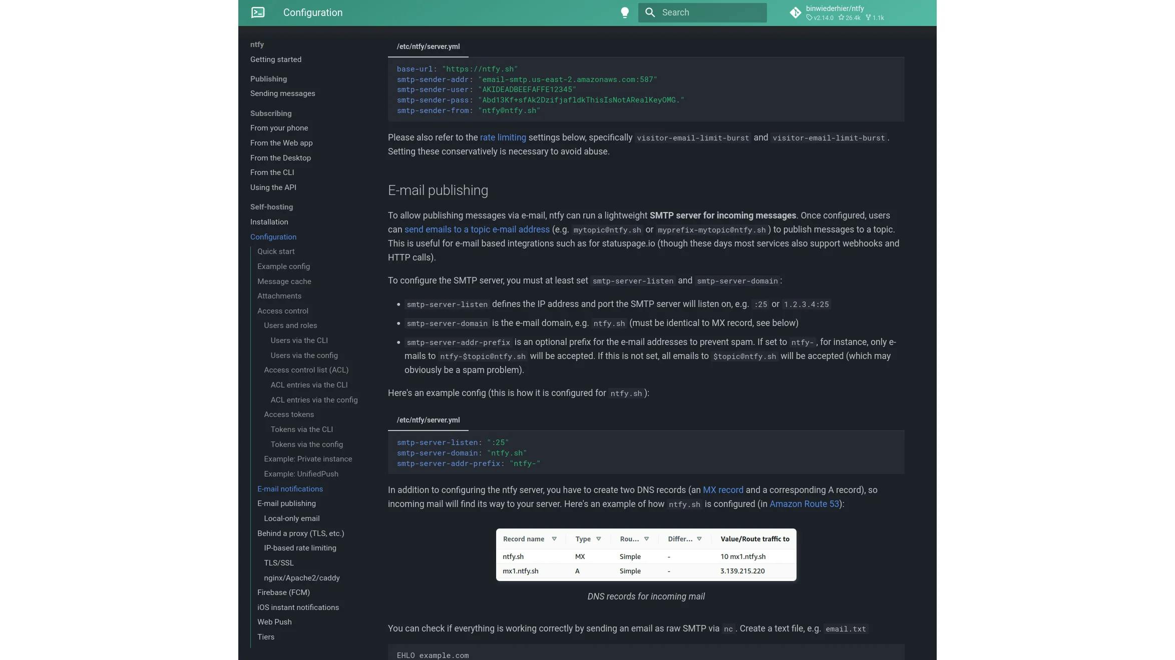 Ook via e-mail is ntfy te integreren. Je kunt bijvoorbeeld berichten die op je ntfy-server aankomen automatisch laten doorsturen naar een SMTP-server om ze ook als e-mail te ontvangen. Maar ook de andere richting is voorzien: ntfy kan dan zelf een ingebouwde SMTP-server draaien, handig voor services die alleen maar notificaties via e-mail ondersteunen. Elk onderwerp op de ntfy-server heeft dan een bijbehorend e-mailadres op je domein. De service hoeft dan alleen maar een e-mail naar dat adres te sturen om berichten op dat onderwerp te publiceren op je ntfy-server. Deze en andere geavanceerde functies zijn uitgebreid gedocumenteerd op de website van ntfy.