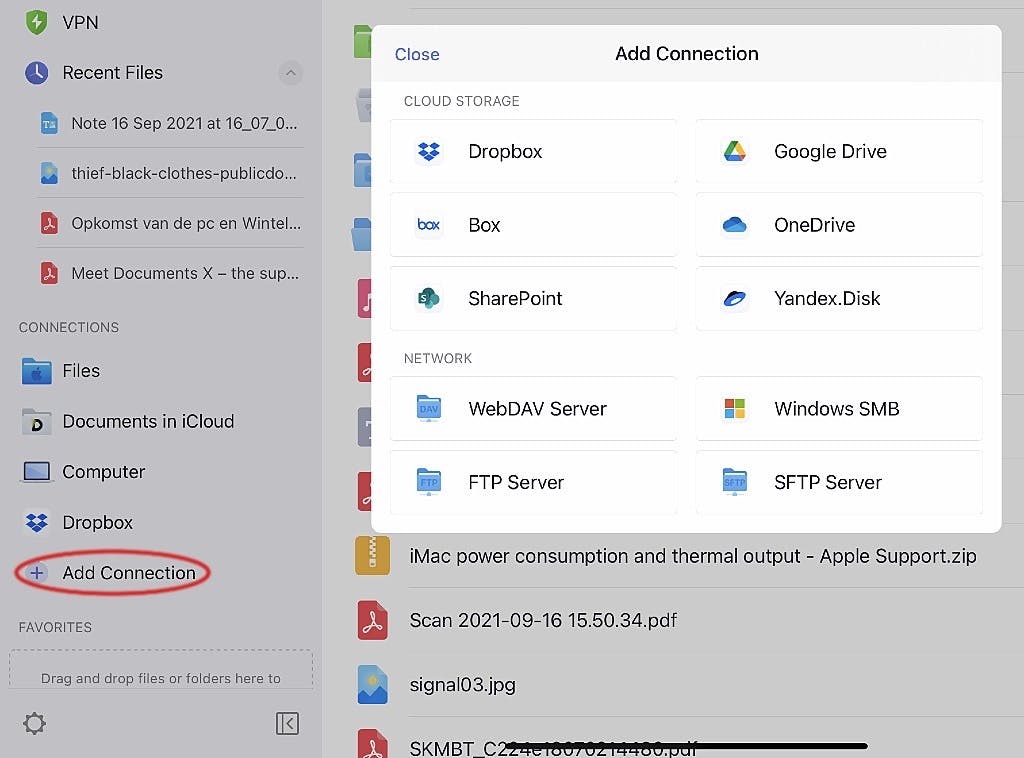 Een van de sterke punten van Documents is dat je allerlei externe opslaglocaties kunt koppelen. Dat kan een cloudopslagdienst als Dropbox zijn, maar ook je NAS. Om dat te realiseren tik je in het paneel links op Add Connection. Kies vervolgens uit een van de beschikbare opties, bijvoorbeeld Windows SMB voor een NAS-share. Vul de gevraagde gegevens in en je hebt voortaan een snelle en makkelijke toegang tot een map op je NAS.