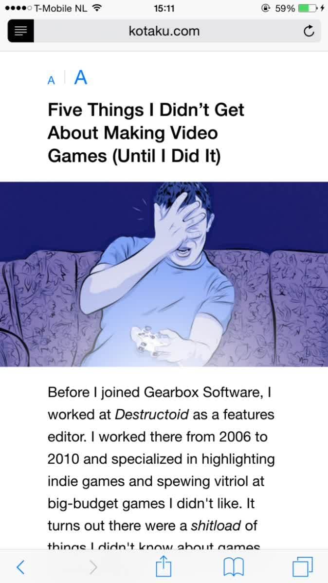 Als een website geschikt is voor Reader-weergave, wordt dat vermeld in de adresbalk. Niet alle websites zijn hiervoor geschikt. Tik op de vier zwarte lijntjes aan de linkerkant van de adresbalk om de pagina meteen in het nieuwe overzichtelijke formaat te bekijken. Tik je nog een keer op dit pictogram, dan komt de oorspronkelijke opmaak weer tevoorschijn.