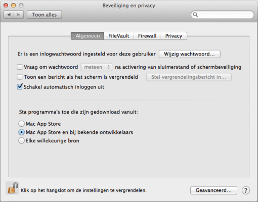 Het tijdperk dat de Mac niet vatbaar was voor malware ligt achter ons. Het is nog steeds een minder groot probleem dan in Windows (dit heeft vooral te maken met het installeren van applicaties) maar het is wel een punt van aandacht. Daarom introduceert Apple Gatekeeper: een zeer heftige poortwachter waarmee u als systeembeheerder kunt instellen dat er alleen maar apps uit de Mac App Store mogen worden geïnstalleerd of alleen apps met een bepaald veiligheidscertificaat van Apple. Een heftige methode, maar wel eentje die het werken met de Mac een stuk veiliger moet maken. Standaard staat ingesteld dat u alleen applicaties uit de App Store mag installeren. Gelukkig kunt u dit wel uitschakelen.