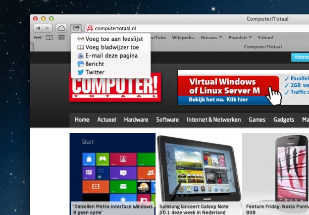 De aanpassing in Safari is even wennen. Apple heeft het zoekveld en de adresbalk gecombineerd tot één veld, in lijn met andere grote browsers. Toch is enige gewenning nodig. Nieuw is de mogelijkheid om iCloud-tabbladen te openen, waarmee u op de Mac verder kunt surfen waar u op de iPhone of iPad gebleven was. Helaas werkt dit pas met de komst van iOS 6. Bent u een actieve gebruiker van de Leeslijst, dan is het fijn om te weten dat Safari nu complete webpagina's in de lijst opslaat, zodat u de pagina's offline kunt bekijken.