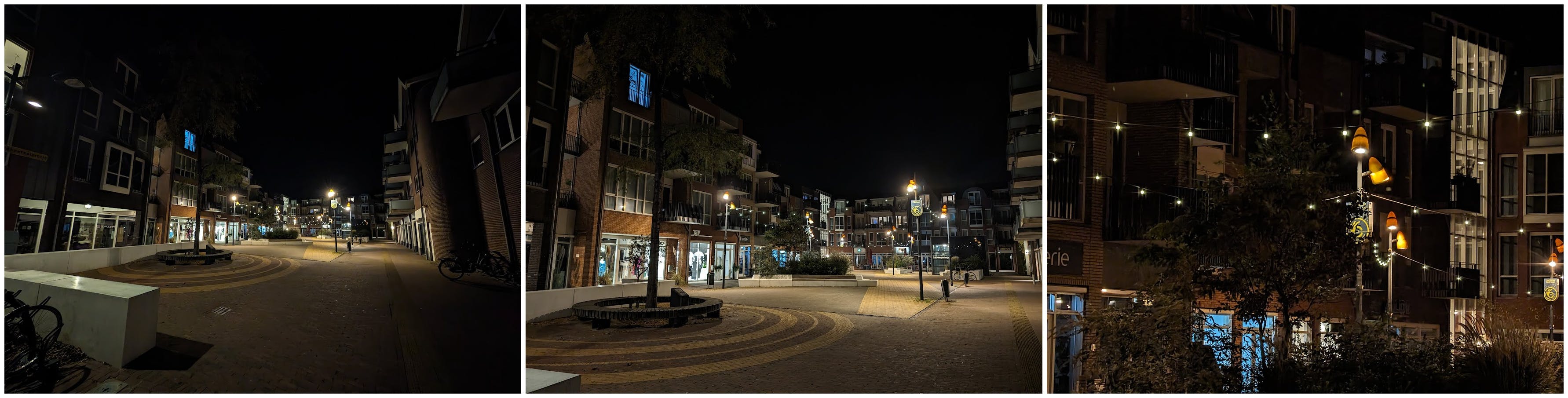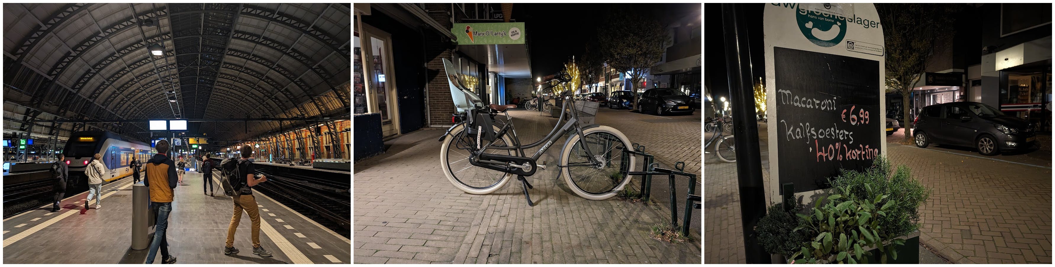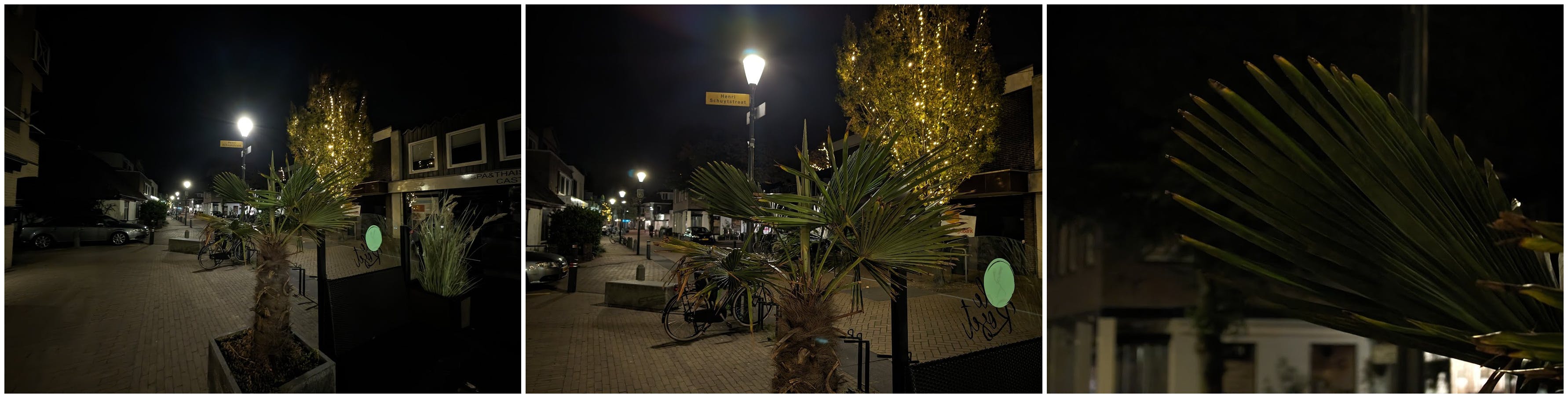 De automatische nachtmodus stelt je in staat om ook in het donker duidelijke foto’s te maken. Ik zet hieronder drie plaatjes uit de hoofdcamera op een rij. Die foto's zijn 's avonds laat genomen, toen het buiten al uren donker was en de enige verlichting kwam van lantaarnpalen, een winkellamp en lampen op het treinstation Amsterdam Centraal.