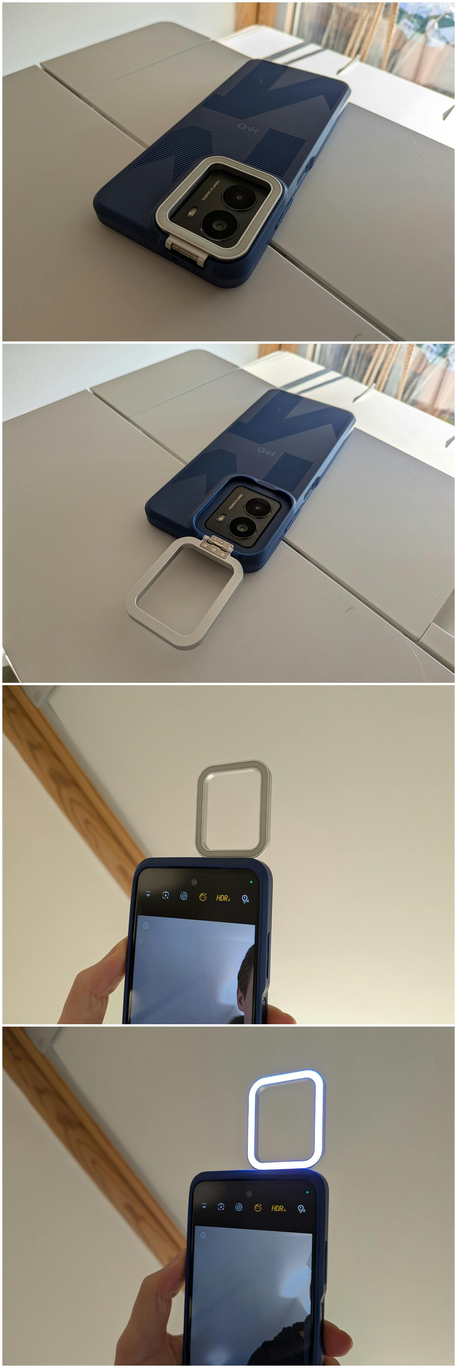 Gelukkig kon HMD ons wel al een hoesje met selfiering opsturen om te testen in combinatie met de Fusion. Dat hoesje is stevig en biedt veel grip. De ledring rond de cameramodule op de achterkant is met een vrije hand makkelijk – maar niet té makkelijk – omhoog te klappen en prijkt dan boven het scherm uit. Vervolgens vind je in de camera-app een instelling voor de aparte flitser, die dus stroom krijgt via het toestel. Je kunt in die instelling onder andere de kleurweergave en helderheid van de flitsring aangeven. De flitsring werkt naar behoren.