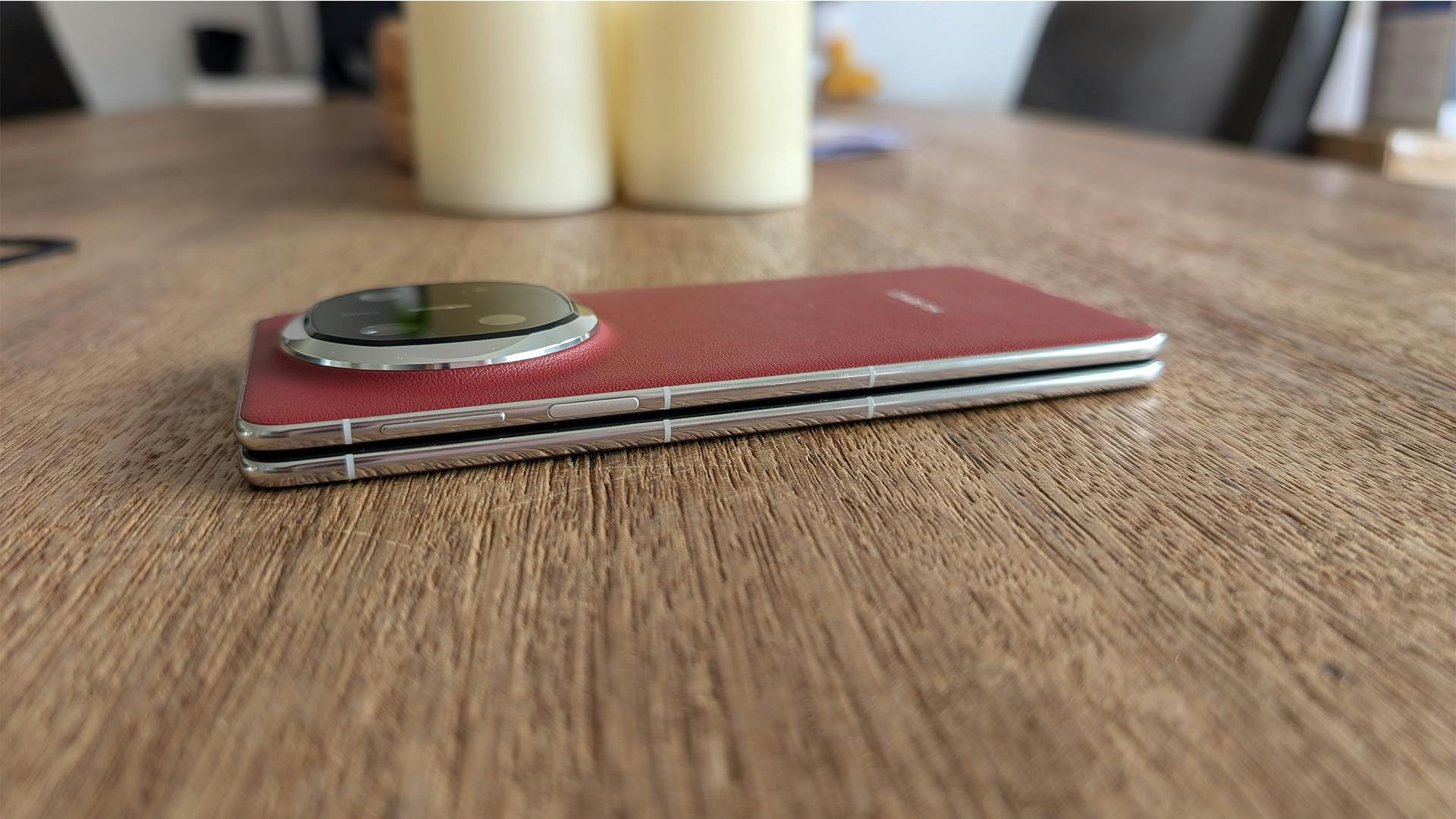 Je merkt wat warmteontwikkeling bij het luxe ogende ecoleer op de achterkant en het aluminium frame, maar bij Samsung ligt dat niveau hoger. Dat komt deels doordat Samsungs processor krachtiger is dan die van Huawei, maar ook minder ingespeeld op de rest van de hardware. De Mate X6 straalt sowieso hoogwaardigheid uit met zijn afgeronde hoeken en relatief platte ontwerp. Dichtgeklapt is hij ongeveer even dun als een Pixel 9 Pro XL. Aan de binnenkant is de vouwlijn nauwelijks zichtbaar, tenzij het licht er precies op valt. Enfin, hier scoort Huawei punten mee.