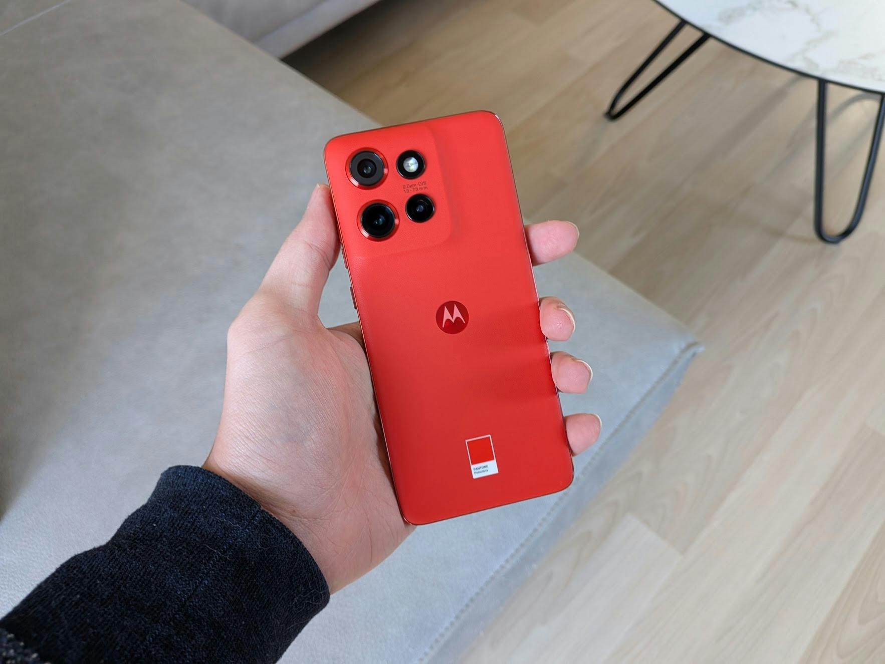 Wat direct opvalt aan de Edge 50 Neo is hoe het toestel in de hand ligt. Met een gewicht van 171 gram is hij wat lichter dan veel andere telefoons. Het scherm is met 6,4 inch niet per se compacter, al zijn er ook genoeg smartphones met een groter scherm. Wij vinden de Edge 50 Neo erg prettig vasthouden, wat komt door het beperkte gewicht én de kunstleren achterkant. Die laat geen vingerafdrukken zien en biedt meer grip dan kunststof, glas of metaal.