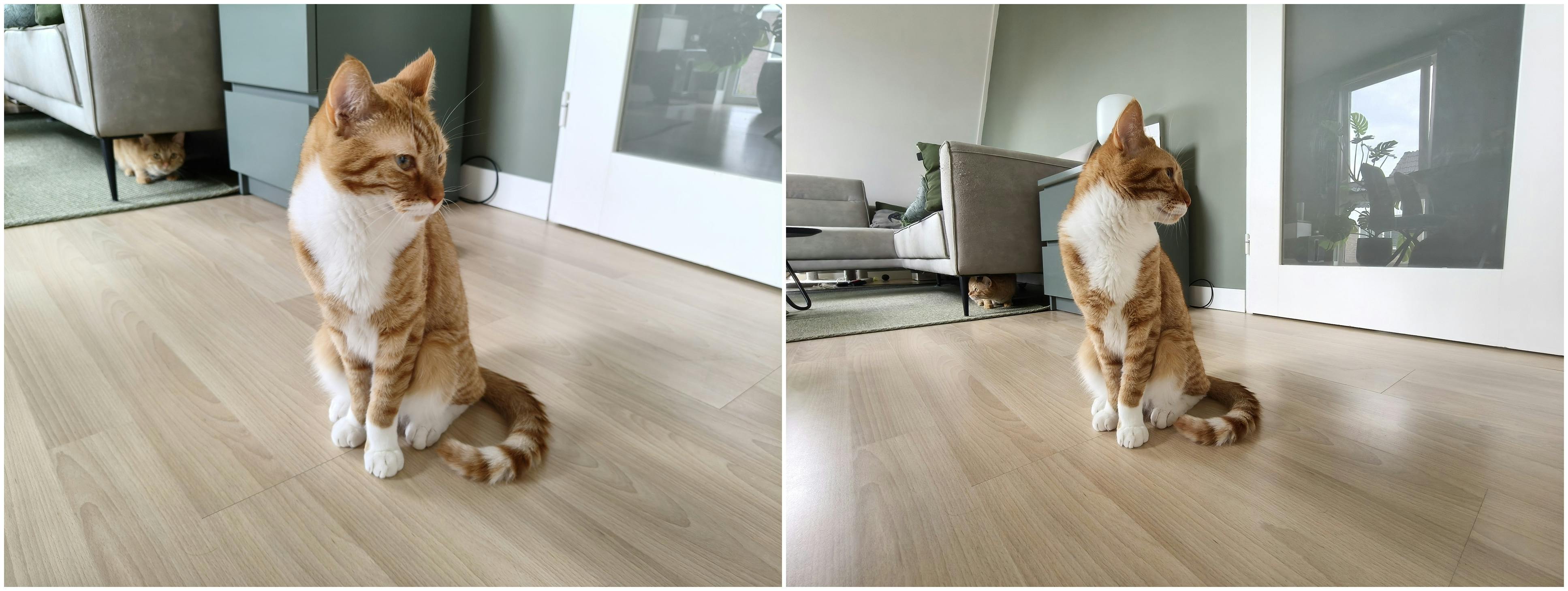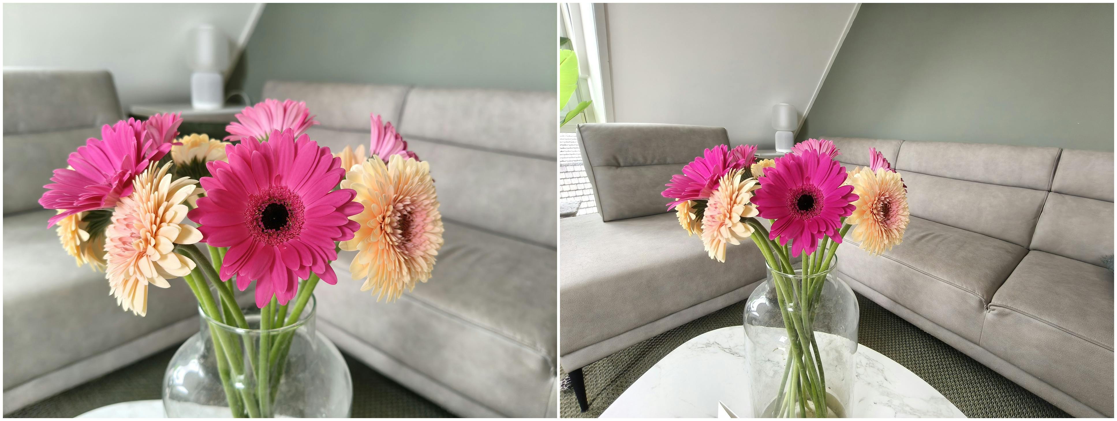 Hieronder zie je twee foto's, eerst gemaakt met de normale camera en rechts zie je de groothoekcamera.