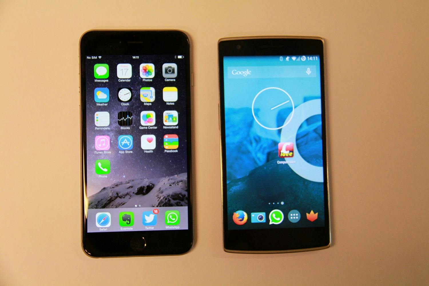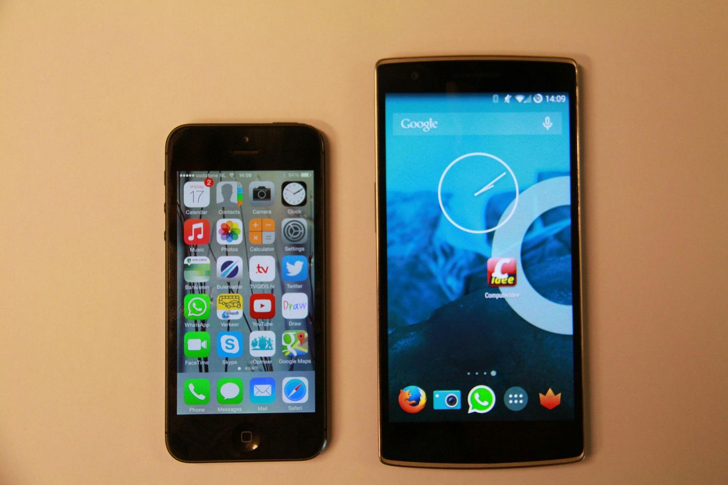 Om je een idee te geven van de grootte van de telefoon, staat hij hieronder op de foto met de iPhone 5S, en daarnaast naast een iPhone 6 Plus.