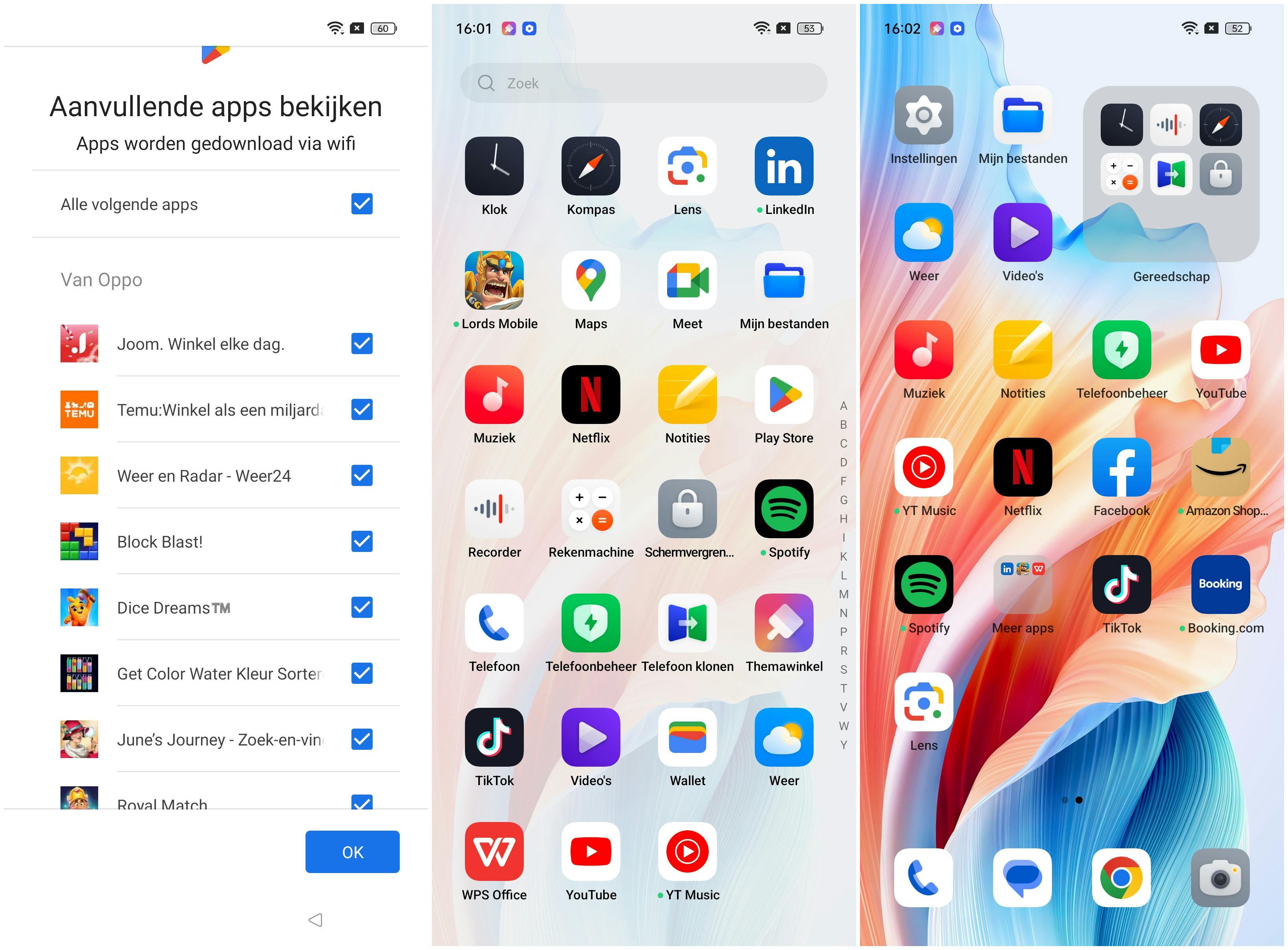 De ColorOS-schil van Oppo die over Android heen ligt, vinden wij persoonlijk nogal druk overkomen. We zijn ook niet enthousiast over Oppo’s verzoek om bij de installatie van de A58 allerlei commerciële apps mee te installeren. Gelukkig kun je die apps weigeren. Maar ook als je die apps niet installeert, vind je bij het eerste gebruik apps als Booking.com, Netflix, Spotify, TikTok, Facebook, LinkedIn en de game Lords Mobile op het toestel. Daar houden we niet van: als we die apps willen, installeren we ze zelf wel. Gelukkig kun je deze apps handmatig verwijderen.