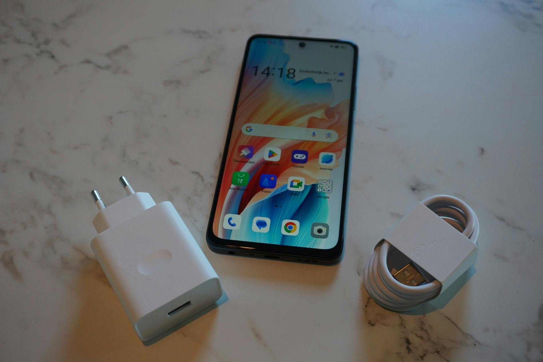 In de Oppo A58 zit een 5000mAh-accu, wat een gebruikelijke capaciteit is voor dit type smartphone. Dat merk je ook in de praktijk. Je kunt de Oppo A58 zonder zorgen een lange dag gebruiken. Pas bij het slapengaan of de volgende ochtend heb je de oplader nodig. De prettige accuduur is ook te danken aan de eenvoudigere specificaties, die minder stroom verbruiken. We vinden het netjes dat Oppo de goedkope telefoon levert met een usb-c-kabel en oplaadadapter. Steeds meer merken schrappen de oplaadadapter, maar de Oppo A58 kun je dus meteen opladen. Helemaal fijn is dat het opladen met 33 watt lekker snel gaat. Je hebt zo’n vijf kwartier nodig om de accu van 0 naar 100 procent op te laden.