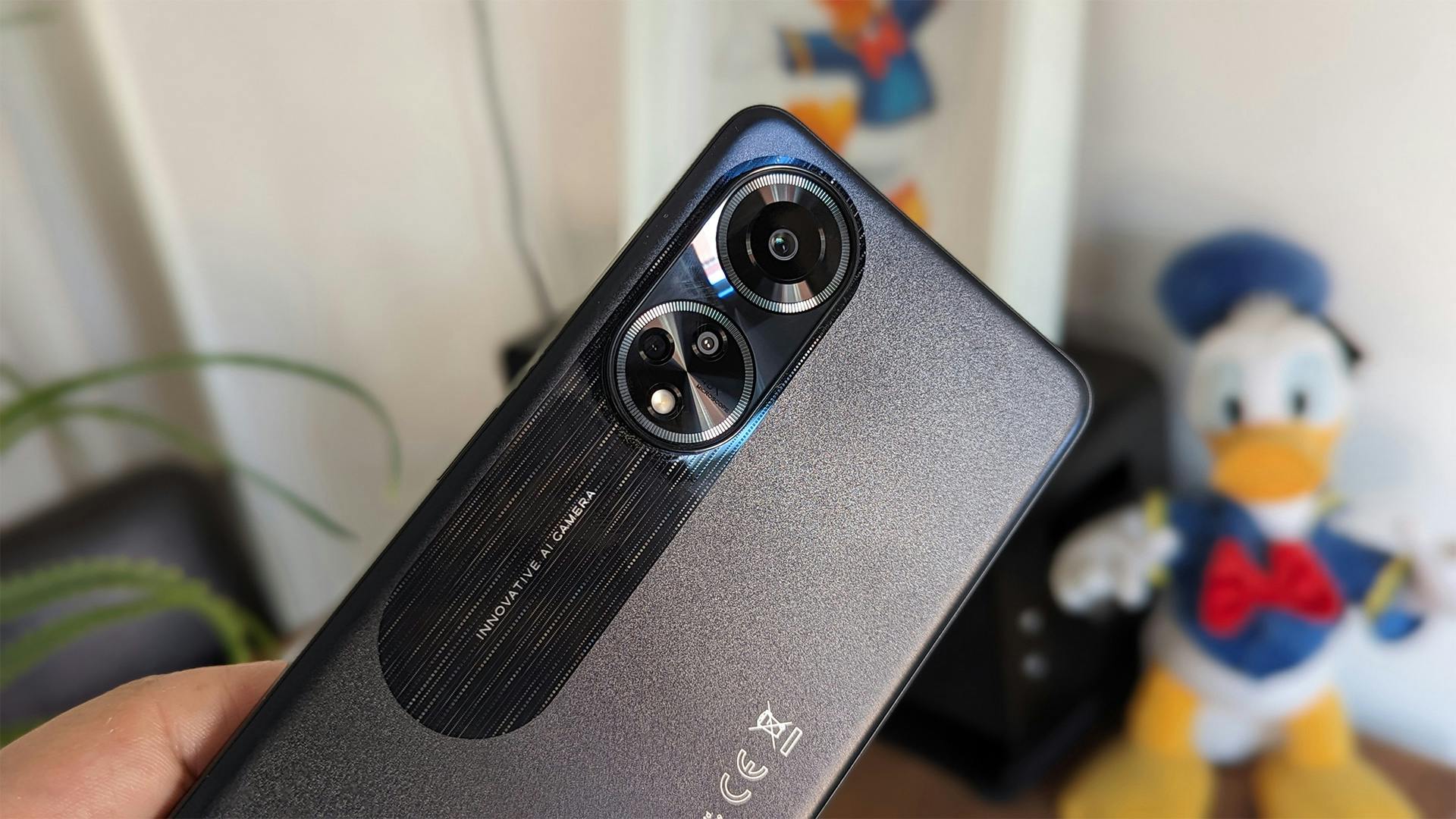 Wanneer je de Oppo A98 5G en Reno 8T naast elkaar zou leggen, dan moet je goed kijken om de verschillen te zien. Achterop treffen we links de cameramodule aan, met als verschil de positionering van één lens en de flitser. Ook bestaat de module nu uit één geheel. Voor de rest hangt er een vreemd ogende strook onder, die net op een goedkope sticker lijkt. De plastic achterkant oogt verder strak en leunt op een tof lichteffect waardoor vingerafdrukken onzichtbaar zijn. Dankzij de breedte van het toestel ligt het lekker in de hand, waardoor je er comfortabel mee kunt typen.