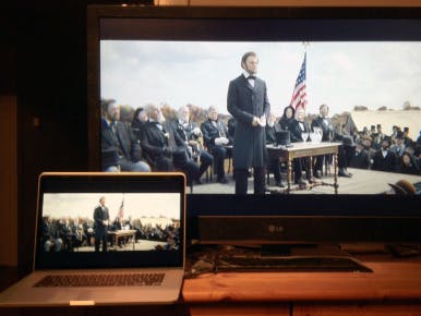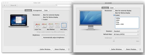 Wanneer een tweede scherm aangesloten wordt om uitbreiding te bieden aan de desktop, verschijnt deze resolutielijst specifiek voor het externe beeld. Toen ik mijn Retina Display MacBook Pro aansloot op mijn 42-inch HDTV herkende het ogenblikkelijk het scherm, en toen ik "mirroring" uitschakelde kon ik één van de vier resoluties kiezen voor de HDTV (zie hierboven) en de Retina MacBook Pro instellen op basis van één van de vijf mogelijkheden die hierboven reeds vermeld werden.