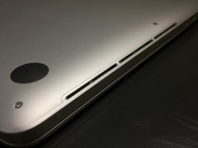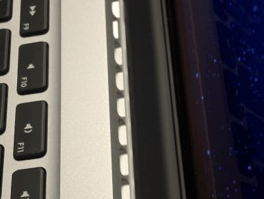 Ook merkwaardig ten overstaan van de normale MacBook Pro zijn de luchtgaten, die zich aan de voorkant van het scherm bevinden. Nadat de installatie van Diablo III voltooid was kon ik het spel spelen in 2880 x 1800 -resolutie en tijdens de gameplay is de ventilatie zeker merkbaar actief. De temperatuur van de laptop nam gevoelig toe in het voorste stuk van de onderkant van de laptop, onder het toetsenbord op de plaats waar de processors zich bevinden. De toename in temperatuur was voor mij zelf hoog genoeg om de laptop hierop naar een bureau te verplaatsen.