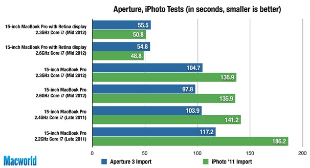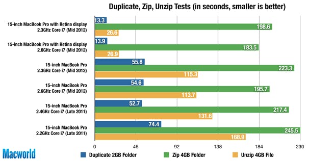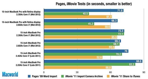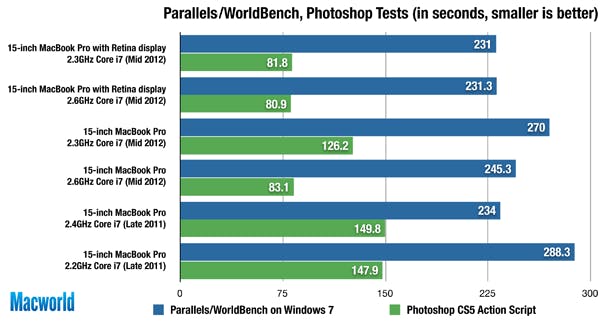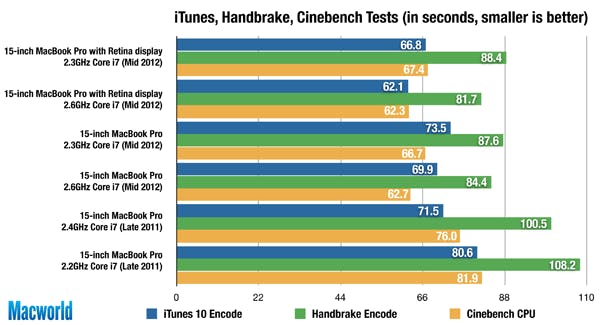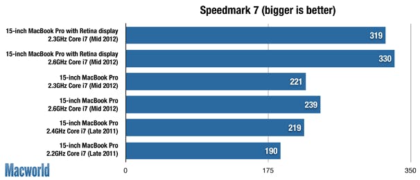 Indrukwekkend genoeg is de 2,6 GHz Core i7 Retina MacBook Pro niet enkel de snelste laptop die we testten, maar zelfs ook de snelste Mac die we getest hebben, met een score van 330. De 2,3 GHz Core i7 Retina MacBook Pro ligt echter niet ver achter met 319 op de snelheidsmeter. De vorige snelste laptop was de 15-inch MacBook Pro i7 2,4 GHz van eind 2011, en de snelste desktop Mac van de peilingen was de BTO 27-inch 2,93 GHz Core i7 iMac met SSD van midden 2010. In vergelijking met de nieuwste 15-inch MacBook Pro (de normale versie, dus) met een 2,6 GHz Core i7-processor, 8 GB RAM-geheugen en een 5400-rpm 750 GB HDD is de 2,6 GHz Core i7 Retina MacBook Pro 38 procent sneller, de 2,3 GHz Core i7 Retina MacBook Pro 33 procent.