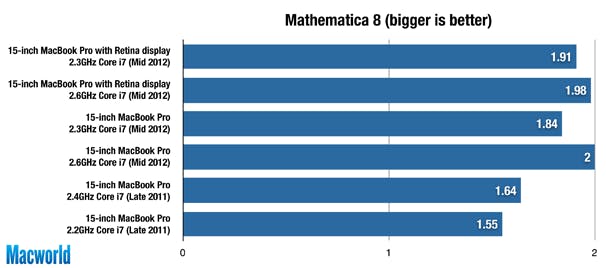 In andere tests die meer op de processor zelf focusten lagen de verschillen tussen de Retina MacBook Pro en de gewone MacBook Pro niet zo ver uit elkaar, zoals in onze Handbrake Encode Test, de Pages Import Test, MathematicaMark en de Cinebench CPU Test.