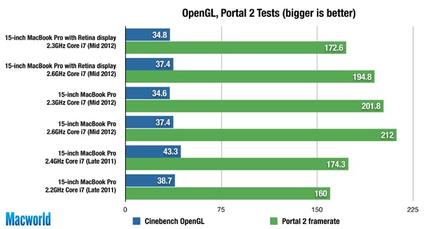 Er was ook een test waarbij de gewone MacBook Pro's duidelijk de overhand hadden op de Retina MacBook Pro's. In de Portal 2 Frame Ratetest was de gewone 2,6 GHz Core i7 MacBook Pro negen procent sneller dan haar Retina-tegenhanger met dezelfde processor. De gewone 2,3 GHz Core i7 MacBook Pro was vier procent sneller dan de 2,6 GHz Core i7 Retina MacBook Pro, maar ook zeventien procent sneller dan de 2,3 GHz Core i7 Retina MacBook Pro. Zelfs al hebben de Retina-laptops en de gewone MacBook Pro's dezelfde grafische kaart (de GeForce GT 650M van de gewone 2,3 GHz MacBook Pro heeft 512 MB aan geheugen, tegenover 1 GB voor de andere laptops), dan nog hebben de Retina displays zo"n groot aantal pixels dat ze zelfs de frame rate van games kunnen beïnvloeden.