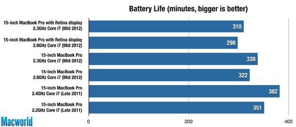 Allebei de Retina-laptops hielden het vijf uur vol in onze test. Zelfs met hun grotere batterijen deden ze het nog niet zo goed als de normale 15-inch MacBook Pro's, die het een aanzienlijk aantal minuten langer volhielden. Opvallend is ook dat de MacBook Pro's van vorig jaar een batterijduur hebben die veruit beter is dan die van de huidige generatie MacBook Pro's.