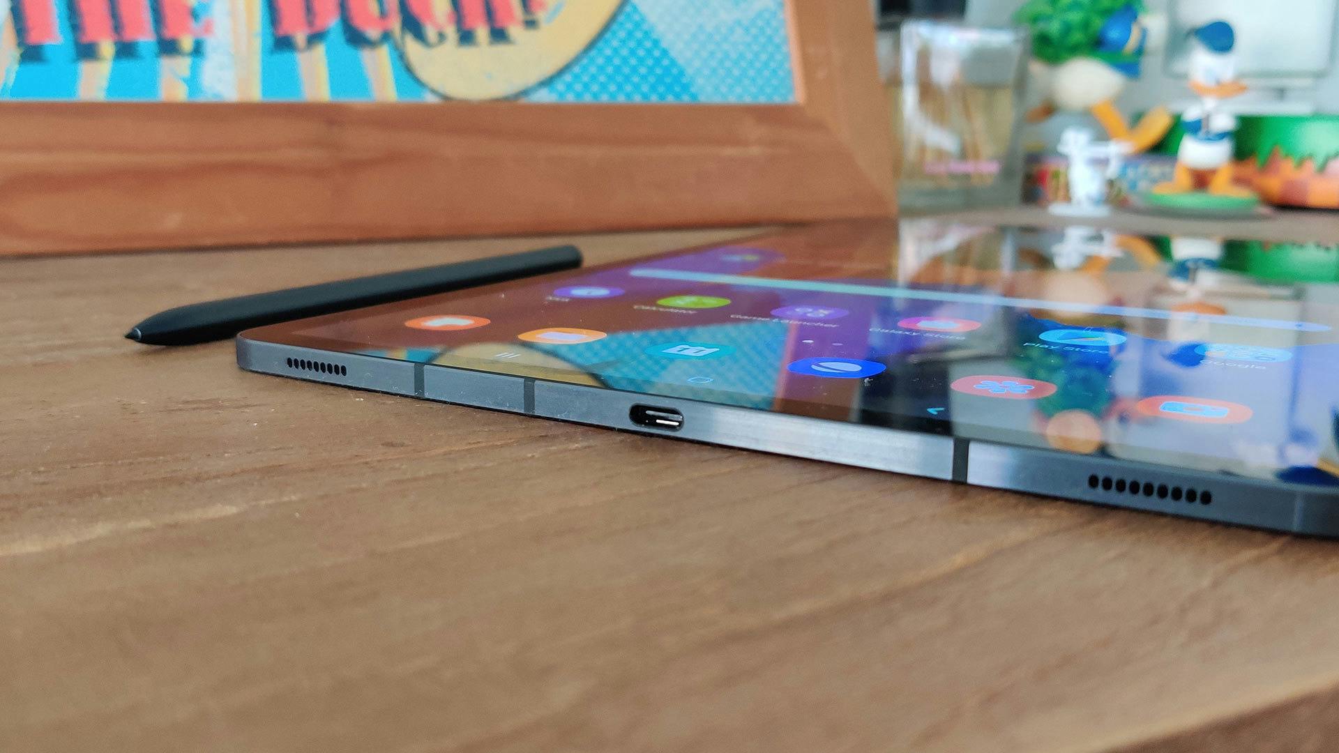 Laten we ook niet de vier speakers aan boord vergeten. Wanneer je de tablet horizontaal vasthoudt, dan zitten die speakers aan de zijkant. Er komt heel helder en mooi geluid uit en we merkten zelfs dat de ondersteuning voor Dolby Atmos (met ruimtelijk geluid) goed z’n best deed. Maar de speakers zitten op een plek waar je handen vaak ook zitten (en anders je buik wel), waardoor het geluid vaak weggemoffeld wordt. En dat gaat dan weer ten koste van de kwaliteit.