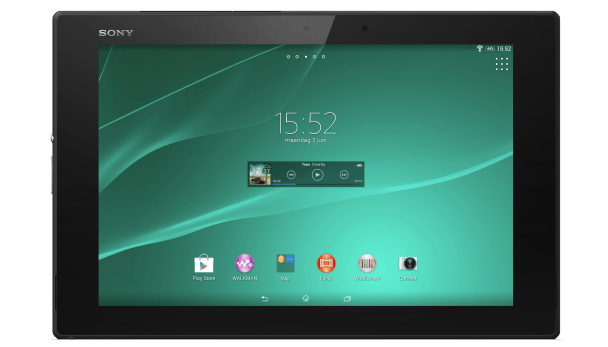 Sony Xperia Tablet Z2 --------------------- **Prijs** € 489,- (16 GB, wifi), € 549,- (32 GB, wifi) **Beschikbare kleuren** Zwart, wit **OS** Android 4.4.2 **Scherm** 10,1 inch lcd (1920 x 1200) **Processor** 2,3 GHz quadcore (Qualcomm Snapdragon 801) **Geheugen** 3 GB RAM, 16 GB opslag (uitbreidbaar met geheugenkaart) **Camera** 8 megapixel (achterkant), 2,2 megapixel (voorkant) **Afmetingen** 17,2 x 26,6 x 0,6 cm **Gewicht** 439 gram **Communicatie** 802.11a/ac/b/g/n, bluetooth 4.0, infrarood **Aansluitingen** Micro-usb, headset **Batterij** 6000 mAh