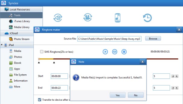 Een leuke toevoeging is nog dat je van een willekeurig muziekbestand automatisch een 'ringtone' kunt maken om die automatisch ook naar je iPhone te uploaden. Syncios hoort normaliter ook contactpersonen te kunnen synchroniseren, maar de tool bleek jammer genoeg geen enkel contactpersoon op onze iPad Air te herkennen.