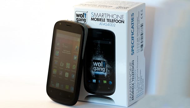 Wolfgang AT-AS40D2 ------------------ **Prijs:** 99 euro **Besturingssysteem:** Android 4.2.2 **Beeldscherm:** 4 inch (800 x 480) **Camera achterkant:** 5 megapixel **Camera voorkant:** 0,3 megapixel **Processor:** 1,3 GHz dualcore **Werkgeheugen:** 512 MB **Opslaggeheugen:** 4 GB (netto 1,32 GB) **Uitbreidbaar geheugen:** MicroSD **Afmetingen:** 126 x 66 x 12,7 mm **Gewicht:** 149 gram