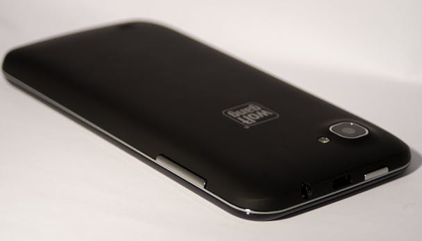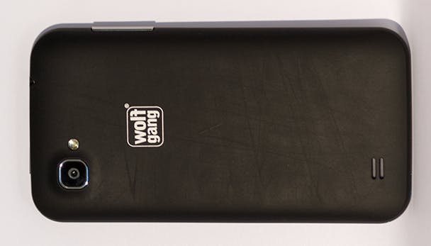 Een groot Wolfgang logo op de wat gevoelige, maar prettig vast te houden achterkant van het toestel.