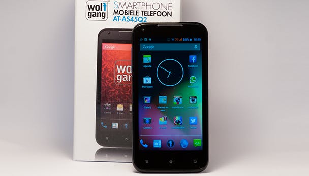 Wolfgang AT-AS45Q2 ------------------ **Prijs:** 189 euro **Besturingssysteem:** Android 4.2 **Beeldscherm:** 4 inch (900x540) **Camera:** 8 megapixel (3 megapixel voorop het toestel) **Processor:** 1.5 GHz quad-core (MediaTek MT6589T) **Werkgeheugen:** 1 GB **Opslaggeheugen:** 4 GB **Uitbreidbaar geheugen:** Micro-sd **Afmetingen:** 131 mm x 67 mm x 10 mm **Gewicht:** 160 gram **Accu:** 2050 mAh **Bijzonderheden:** Dual-sim functie