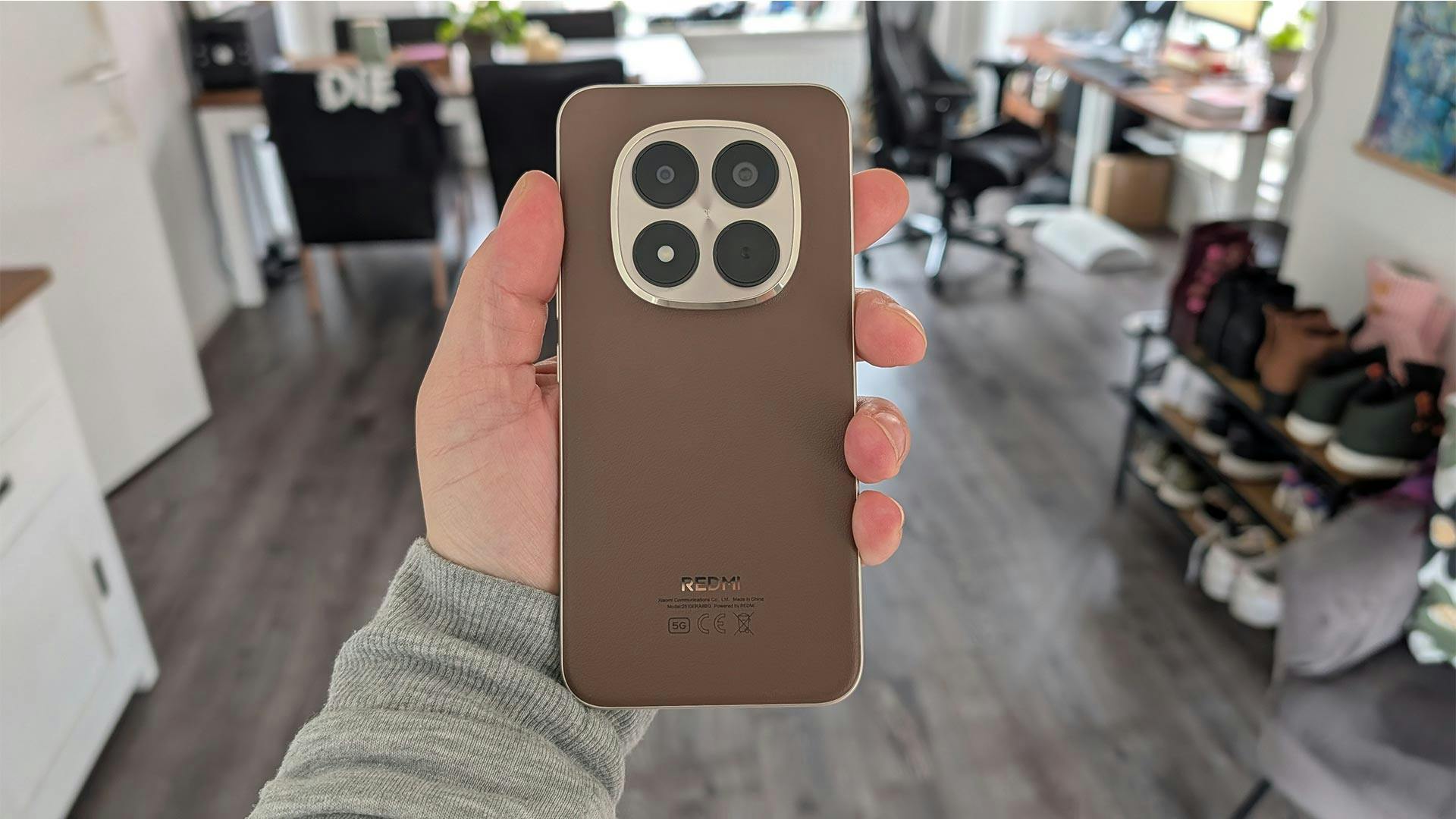 De Xiaomi Redmi Note 15 Pro Plus volgt moderne trends met een stevig ontwerp en platte zijkanten. De variant die wij testen (Mocha Brown) valt op door een achterkant van vegan leer, dat voor extra grip en een luxe gevoel zorgt. Zeker in vergelijking met de doorgaans glazen ruggen van concurrenten. Met 207 gram is hij niet zwaar, maar andere midrangers kunnen gemiddeld genomen lichter zijn. Verder is de IP69K-certificering indrukwekkend, waardoor het toestel bestand is tegen stof, water, hogedrukspuiten (!) én hoge watertemperaturen.