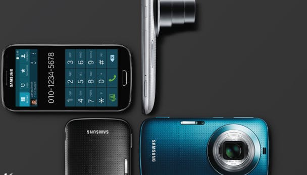 Samsung Galaxy K Zoom --------------------- **Adviesprijs:** € 489,- **Besturingssysteem:** Android 4.4.2 KitKat (TouchWiz) **Beeldscherm:** 4,8 inch AMOLED **Resolutie:** 720 x 1280 pixels **Gewicht:** 200 gram **Afmetingen:** 138 x 71 x 20 mm **Processor:** 1.7GHz Dual + 1.3Ghz Quad **Werkgeheugen:** 2 GB **Opslagcapaciteit:** 8 GB + microSD-geheugenslot **Camera voorzijde:** 2 megapixel **Camera achterzijde:** 20.7 megapixel **Flitser:** Xenon