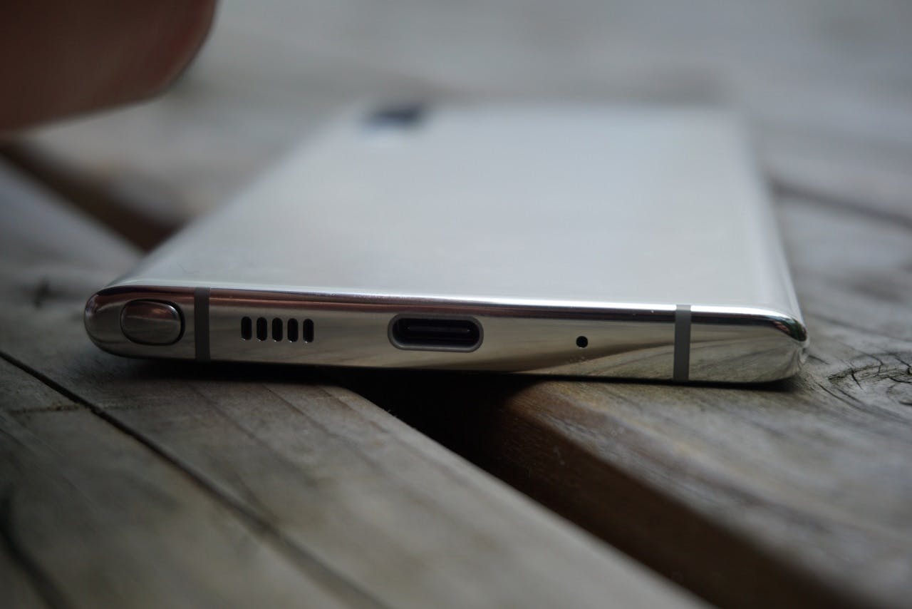 Waar je waarschijnlijk wél iets van merkt, is het feit dat de Note 10 en Note 10 Plus geen 3,5mm-hoofdtelefoonaansluiting hebben. Voor het eerst schrapt Samsung de vertrouwde audiopoort op zijn high-end smartphones, nadat hij eerder al verdween op meerdere goedkopere toestellen zoals de Galaxy A80. Volgens Samsung liet de Note 10 (Plus)-behuizing geen ruimte over voor de hoofdtelefoonpoort. Dat is lastig te controleren zonder de smartphone uit elkaar te halen, maar klinkt wat ongeloofwaardig bij een smartphone van dit formaat. Niet iedereen zal het gebrek aan de audio-aansluiting erg vinden, maar voor sommige gebruikers is het een minpunt. Samsung levert wel usb-c-oordopjes mee en je kunt ook een usb-c-naar-3,5mm-adapter gebruiken om traditionele hoofdtelefoons en oordopjes aan te sluiten.