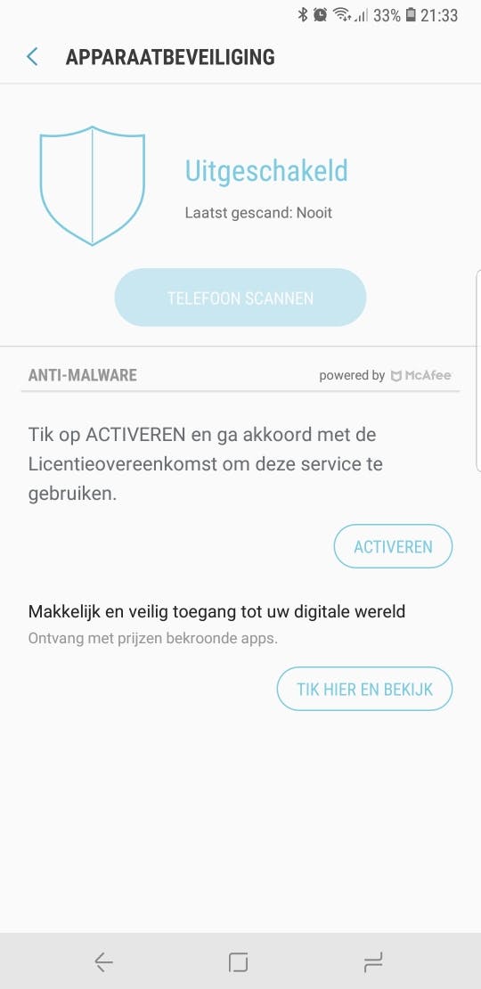 Maar je weet dat je bij Samsung Galaxy smartphones ook een hoop onnodige apps voorgeïnstalleerd krijgt. Zo zijn er twee browsers, twee fitnessapps, twee appstores, twee mailapps, enzovoort. In de instellingen maakt Samsung het bonter, door onder apparaatbeheer misleidende antivirus en onnodige werkgeheugen-optimalisatie toe te voegen. Door het op deze manier te vermommen is het niet uit te schakelen.