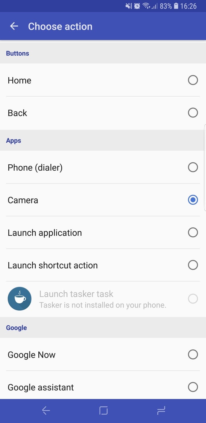 Samsung mag dan wel geen optie (meer) bieden om Bixby en de bijbehorende knop uit te zetten, de app bxActions kan dat wel. Hierdoor kon ik de knop de functie geven om de camera te starten, wat voor mij veel praktischer was.
