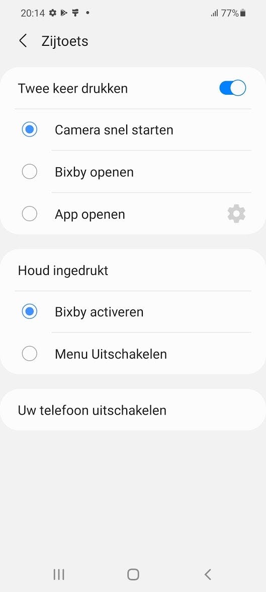 OneUI zit namelijk vol apps van Samsung en partners, wat ik druk vind. Ook toont de software regelmatig reclames, met name via de Galaxy Store-app. Die advertenties kun je uitschakelen in de app, maar wie weet dat? Ook treurig is Samsungs obsessie met zijn Bixby-spraakassistent, die standaard in beeld komt als je de aan- en uitknop ingedrukt houdt. Dat doe je omdat je de S21 wilt uitschakelen, niet om gestoord te worden door een app die niet eens Nederlands begrijpt. Je moet de instellingen induiken om bij het uitschakelen van het toestel daadwerkelijk de uitknop in beeld te krijgen. Door dit soort beslissingen voelt Samsungs software onlogisch aan, alsof eigen diensten belangrijker zijn dan de gebruikerservaring.