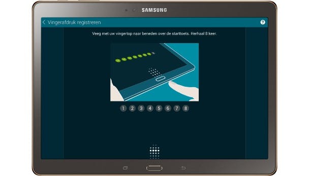 Net als op de Galaxy S5 is de tablet voorzien van een vingerafdrukscanner in de thuisknop. De vingerafdrukscanner werkt net als op de Galaxy S5 via een veegbeweging en werkt redelijk. Toch wordt niet altijd in één keer onze vingerafdruk herkend. Lukt het helemaal niet, dan kun je gelukkig altijd nog een wachtwoord ingeven. We beschouwen de vingerafdrukscanner vooralsnog als een leuk extraatje.