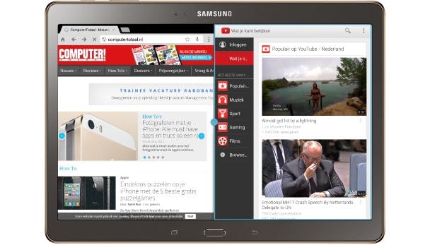 De Galaxy Tab S 10.5 is een indrukwekkende tablet die een lichte behuizing combineert met een prachtig scherm. Het Super AMOLED-scherm zorgt voor goede inkijkhoeken, een diep zwart en spetterende kleuren. De hardware is krachtig, maar helaas zien we soms wat haperingen die vermoedelijk komen door softwareschil TouchWiz die Samsung over Android heeft gelegd. We zijn nooit echt enthousiast geweest over TouchWiz, maar Samsungs aanvulling om twee apps naast elkaar te gebruiken vinden we wel erg handig. Samsung maakt de tablet af door het prima officepakket Hancom Office 2014 mee te leveren.