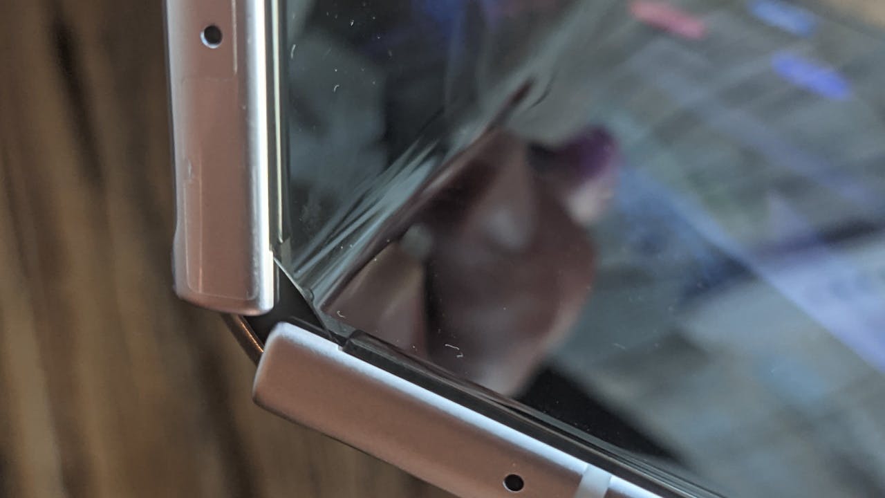Samsung heeft geen vingerafdrukscanner onder het scherm geplaatst, maar heeft ervoor gekozen een fysieke scanner in de aan-uitknop aan de zijkant van de Galaxy Z Fold3 te plaatsen. Dat is prettig in gebruik, want de fysieke vingerafdrukscanner werkt sneller en nauwkeuriger. Maar ook zo praktisch, aangezien Samsung anders twee scanners onder de schermen had moeten plaatsen. In de bovenzijde van de schermen vind je wel de frontcamera in een punchhole geplaatst. Bij het grote scherm heeft Samsung nog geprobeerd deze te camoufleren door er wat lichtgevende schermpixels overheen te plaatsen. Dat heeft een negatief effect op de opnamekwaliteit van de selfiecamera en de punchhole blijft nog altijd duidelijk zichtbaar. Het lijkt een voorbode op technologie die in ontwikkeling is om de frontcamera helemaal achter het scherm te kunnen plaatsen zonder dat hier een inkeping of cameragat voor nodig is.