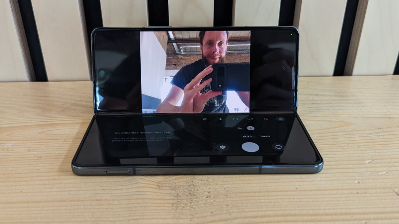 Tevens kun je het toestel half uitklappen. Een beetje zoals een laptop. Zo kun je het toetsenbord op de onderste schermhelft plaatsen of meer halen uit de camera’s. Als je het toestel half opengeklapt op een vlakke ondergrond zet kun je de frontcamera bijvoorbeeld gebruiken voor videobellen, of de drie camera’s aan de achterzijde voor fotografie.