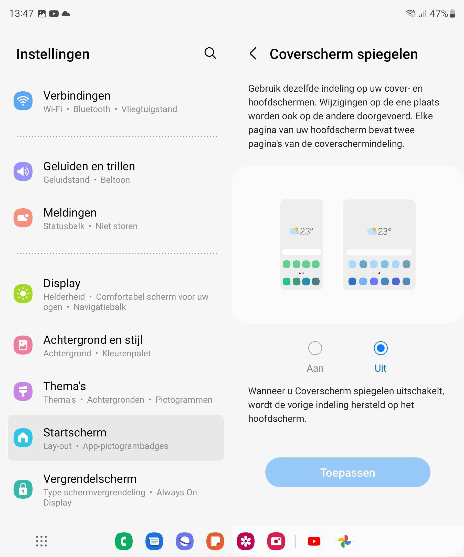 Het kleine scherm aan de buitenzijde is een glazen amoledpaneel, wat krasbestendiger is en de mooiste weergave biedt. Het vouwbare amoledscherm is qua kleurweegave gelijkwaardig, maar oogt iets minder helder en de vouwlijn in het midden is hinderlijk. Deze zie je, en voel je.
