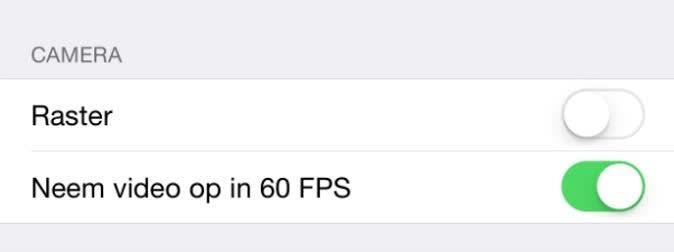 3. Scroll naar het kopje CAMERA en vink Neem video op in 60 FPS aan