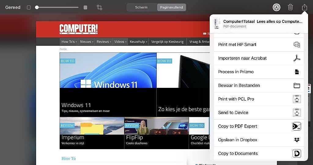 Heb je een screenshot van een webpagina in Safari gemaakt, dan wordt het interessant. Tik op de preview voordat deze verdwijnt. Je ziet nu een grotere versie van de preview. Tik hierin op de knop Paginavullend bovenaan. Je ziet nu een strook aan de rechterkant verschijnen met daarin de complete automatisch doorgescrolde en vastgelegde webpagina in z’n volledig oorspronkelijke opmaak. Tik je nu op de deelknop rechtsboven, dan zul je zien dat het hier een PDF-bestand betreft dat je kunt delen naar bijvoorbeeld je favoriete PDF-viewer. Of bewaar het resultaat in een map.