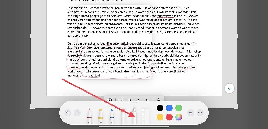 De truc om een schermafbeelding automatisch gescrold vast te leggen werkt vooralsnog alleen in Safari en Mail. Ook reguliere screenshots van andere apps zijn echter te behandelen met alleraardigste extraatjes. Je maakt ze zoals gebruikelijk weer met de al genoemde toetsen. Tik snel op de preview alvorens deze verdwijnt. Je bent nu – net als in het andere voorbeeld hierboven natuurlijk – in de screenshot-editor aanbeland. Je kunt vervolgens heel snel aantekeningen maken op een schermafbeelding. Maak daarvoor gebruik van de pen in de knoppenbalk onderin; via de paletkleuren kies je een schrijfkleur. Je kunt schrijven met je vinger of een muis, het allerprettigst werkt het vanzelfsprekend met een Pencil. Gummen is eveneens een optie, terwijl ook een markeerstift paraat staat. De ‘vreemde’ pen met de gearceerde punt maakt het mogelijk om een notitie of getekend onderdeel te selecteren en verplaatsen.