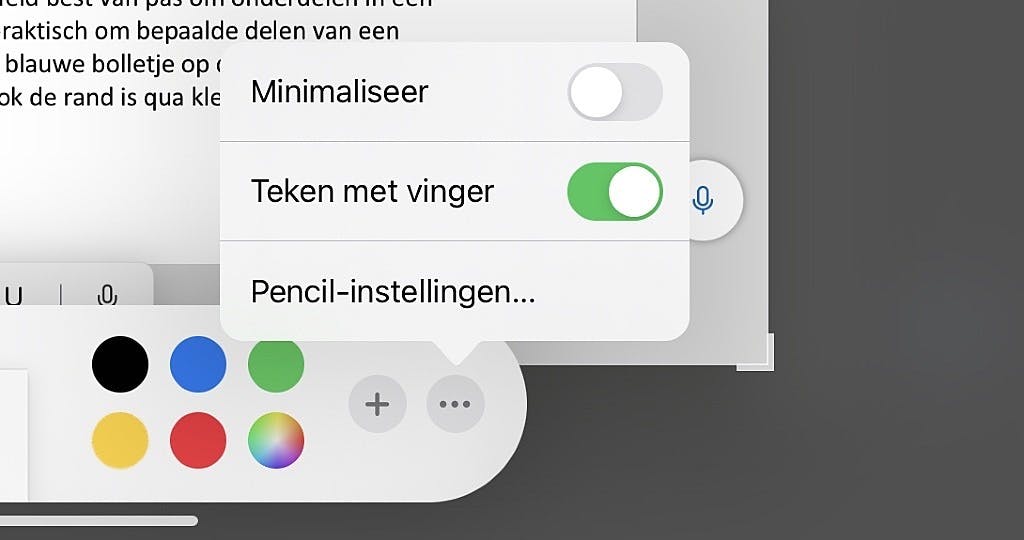 Handige tip: kun je niet met je vinger tekenen, dan is het zaak om even op de knop … helemaal rechts van het gereedschappenpaneel onder in beeld te tikken. Zet vervolgens de schakelaar Teken met vinger aan en je kunt losgaan. Die schakelaar zit er trouwens niet voor niets, want als je met de Pencil aan de slag wilt gaan is het handiger om die knop uit te zetten. Daarmee voorkom je dat je per ongeluk tekent met een zwabberende vinger.