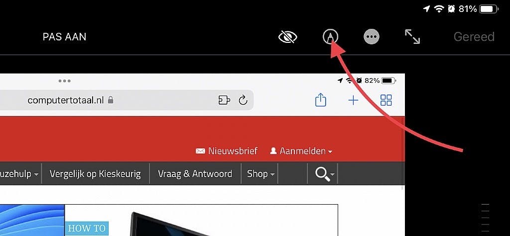 Het enige ‘nadeel’ dat de screenshotmaker heeft is eigenlijk dat de preview vrij snel verdwijnt. Je loopt dus de kans dat je er net naast grijpt. Een onoverkomelijk drama? Meestal niet, gelukkig! Open in zo’n geval de app Foto’s, alwaar je de net gemaakte screenshot terugvindt. Open de afbeelding en tik op Wijzig. Tik vervolgens op het pictogram met ’t omcirkelde pennetje in de knoppenbalk bovenaan. Vervolgens kun je als nog aan de slag met het toevoegen van notities, markeringen, vormen en veel meer. Het enige dat niet werkt via deze weg is de mogelijkheid om een scrollende webpagina als PDF vast te leggen. Daarvoor moet je echt op de preview klikken zodra deze getoond wordt.