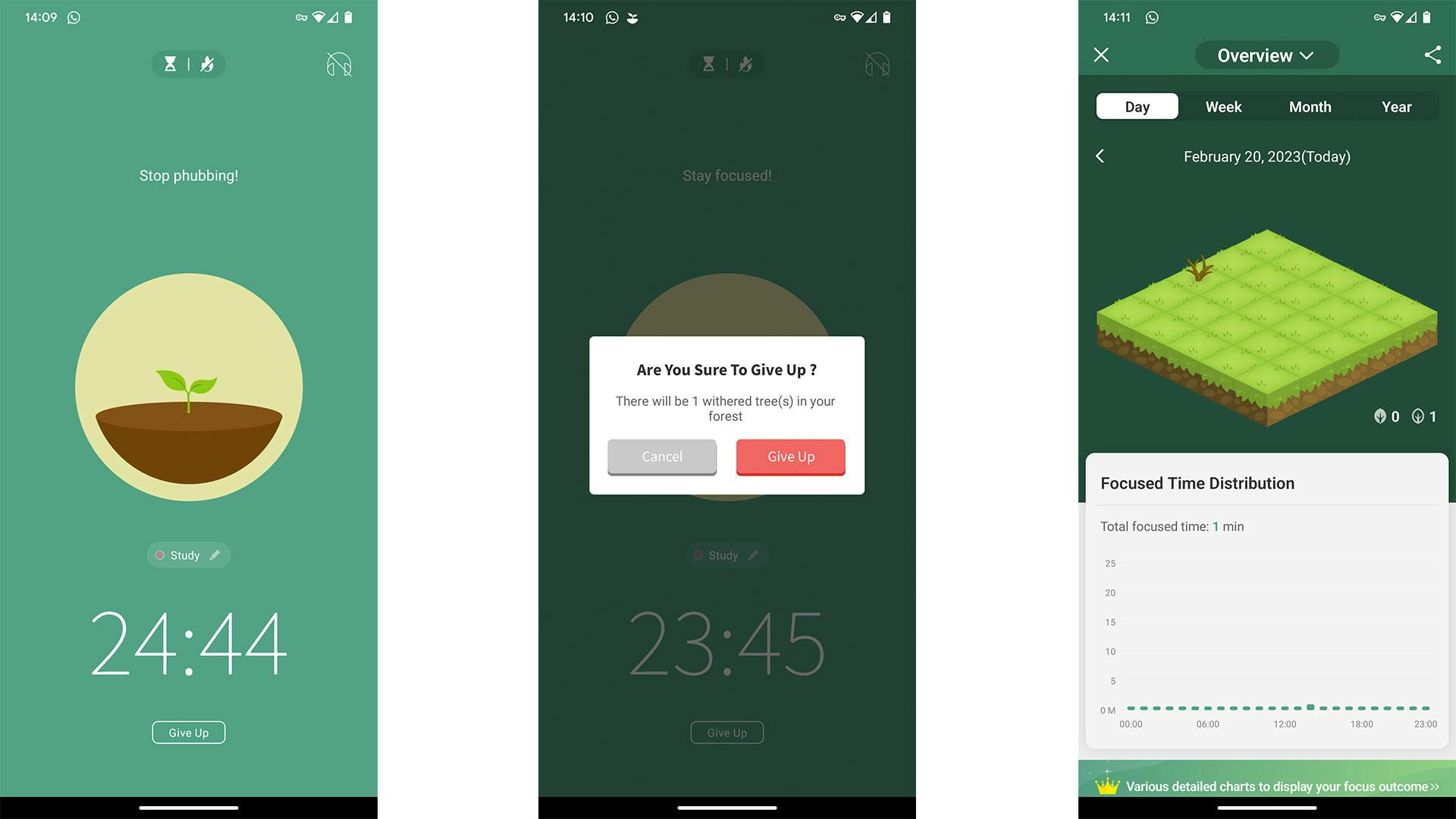 De app probeert je verder te belonen door nieuw boomsoorten te introduceren. Je kunt herinneringen instellen om je smartphone neer te leggen en middels uitgebreide statistieken zien hoe goed je je best hebt gedaan. Daarnaast is het mogelijk bomen op de echte aarde te planten. Daar moet je verdiende munten aan besteden; per persoon kun je tot vijf bomen door Forest laten planten.
