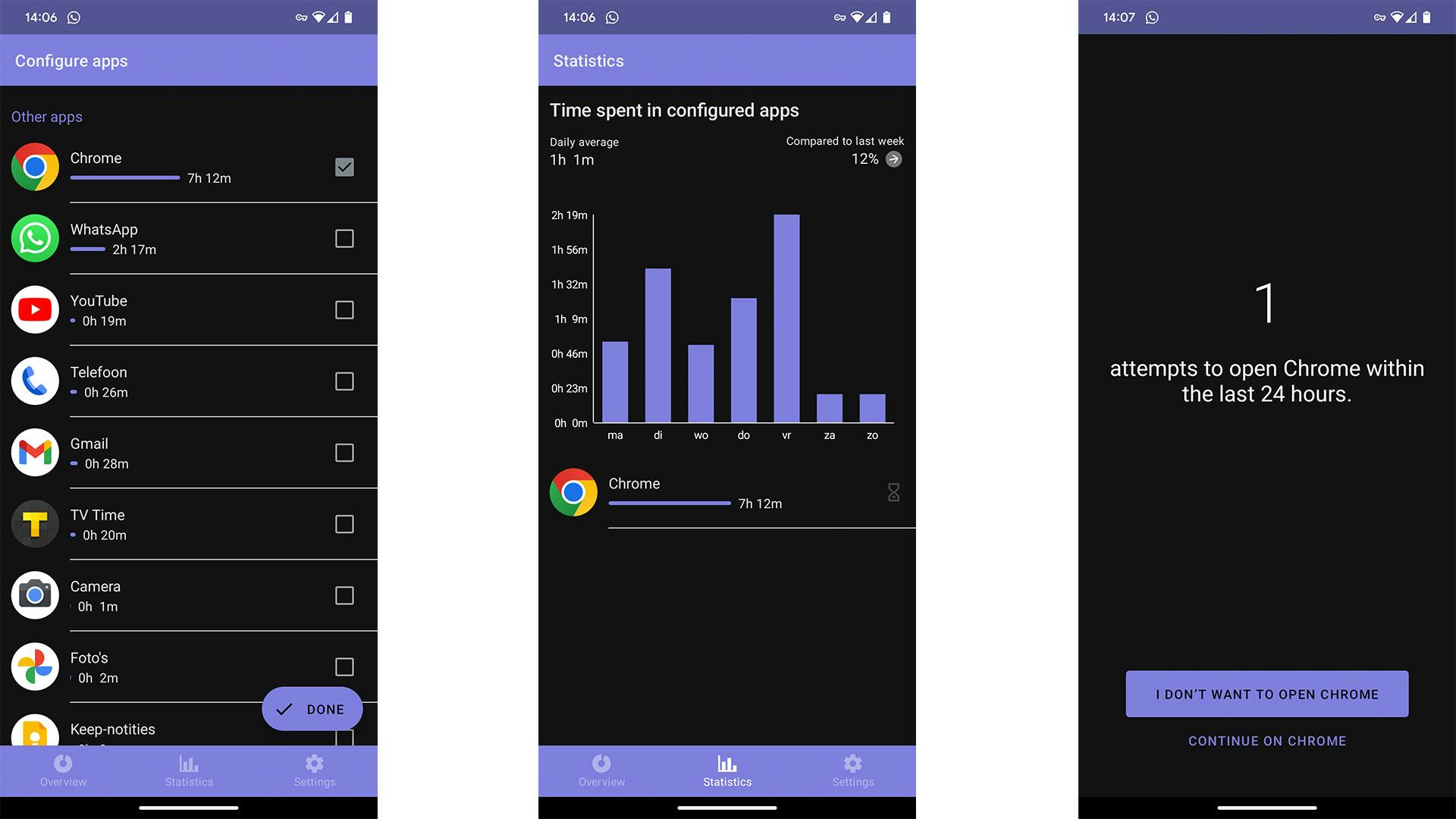 Je kunt apps blokkeren en zelfs een slaapstand instellen: dan worden alle apps uitgeschakeld. Er is ook een vergrendelingsmodus die de instellingen alleen met een wachtwoord toegankelijk maakt. Kun je het niet laten om alsnog met je telefoon bezig te zijn of een instelling aan te passen waardoor dat weer mogelijk is? Laat iemand anders dan dat wachtwoord instellen, dan kom je ook niet meer in de verleiding.