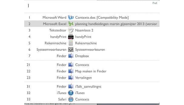 Houd je toch meer van het toetsenbord? Dan kun je Contexts ook besturen met handige toetsencombinaties. Wanneer je de Option-toets op je toetsenbord ingedrukt houdt en (bijvoorbeeld) drukt op het cijfer 1, dan verschijnt er een lijst met beschikbare programmavensters, met daarvoor een cijfer. Druk op dat cijfer (of typ de naam van het venster) om dat betreffende venster te openen.