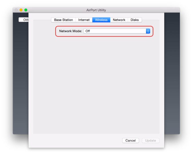 Verbind je computer met de AEBS via ethernet. (Onthoud dat we de wifi-radio uit gaan zetten, dus binnen een zeer korte tijd zal dat de enige manier zijn waarop je er verbinding mee kunt maken.) Open AirPort Utility, klik op het icoon van je Base Station, en klik op Edit. Selecteer het Wireless-tabblad, klik op het pop-up-tabblad naast Network Mode, en kies Off. Klik op de Update-knop en klaar is Kees. Het enige wat je nu gedaan hebt is de wifi-radio uitschakelen. Er verandert verder niets - je AEBS biedt nog steeds alle functies zoals voorheen, maar nu kan hij ze alleen aan apparaten leveren die er via ethernet mee verbonden zijn.