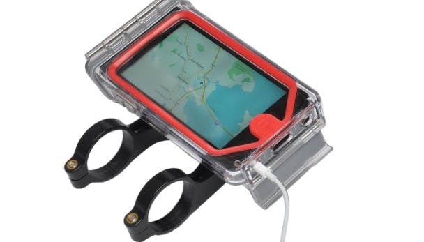 Deze bundel bestaat uit een klem die je op je stuur zet en een case die je om je iPhone klikt. De prijs voor de set is maar liefst 130 euro, maar daar krijg je ook wat voor. De behuizing kan tegen een stootje en is waterdicht. De iPhone past perfect en het scherm is nog eenvoudig te bedienen. De onderkant kun je afsluiten of als het niet regent, openen om bijvoorbeeld een koptelefoon aan te sluiten. Het leuke van de Optrix-case is dat je de klem ook staand kunt monteren zodat je de camera van je iPhone naar voren kunt richten. Zo maak je in een handomdraai een actievideo van je trip. Bedenk wel, dat de Optrix CycleX alleen op sturen van 31,8 mm past. Het nadeel van een iPhone is dat de accu niet lang meegaat, zeker als je bluetooth steeds aanstaat en al je bewegingen registreert met de gps-ontvanger. De oplossing is de NC-17-case.