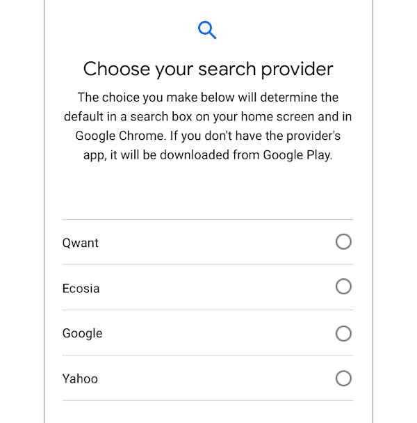 De zoekgigant toont vandaag hoe dat keuzemenu er uit ziet. Wanneer je een Android-apparaat voor de eerste keer instelt, doorloop je verschillende stappen. Zo koppel je een Google-account en maak je verbinding met het juiste wifi-netwerk. Straks komt er een extra venster bij, waarin je bepaalt welke zoekmachine je wilt gebruiken. Vier opties in willekeurige volgorde; Google staat dus niet altijd bovenaan. Het effect van je keuze zie je terug als zoekbalk op je homescherm en als de standaard zoekmachine in Chrome.