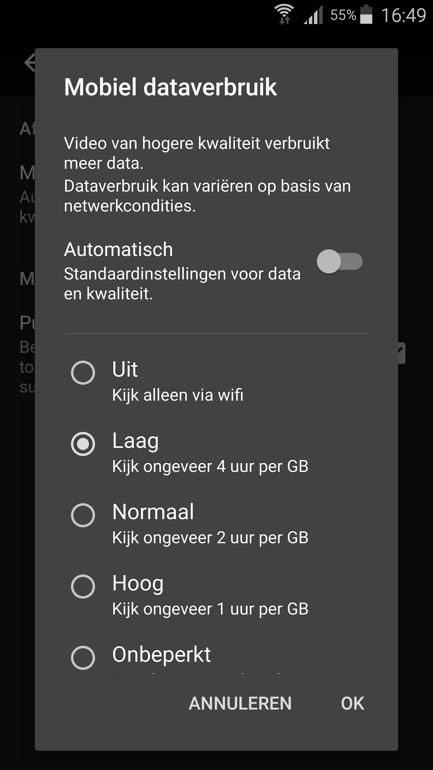 Netflix kijken via mobiel internet? Het kan prima, zeker met 4G, al vormt het wel een aanslag op je databundel. Dat verandert waarschijnlijk niet snel: providers mogen volgens de wet geen ‘onbeperkt Netflix’ aanbieden vanwege oneerlijke concurrentie. Gelukkig worden databundels wel steeds groter. Heb je een enorme databundel en wil je graag in de hoogste kwaliteit kijken, of heb jij juist een krappe databundel en wil je data besparen? Je hebt zelf de controle over de kwaliteit van de streams van Netflix. Daarvoor blader je via het menu naar App-instellingen en klik je op Mobiel dataverbruik. Bij een lage kwaliteit verbruik je ongeveer 250 MB in een uur, bij Onbeperkt ga je daar met gemak overheen maar is alles wel superscherp.