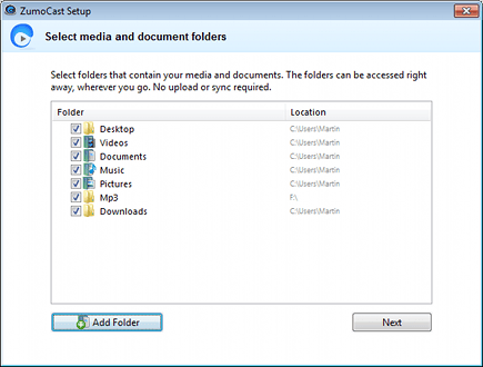 Tijdens de installatie geeft u aan welke mappen u wilt delen met andere ZumoCast-apparaten.